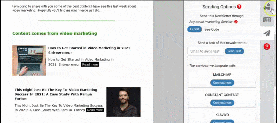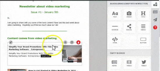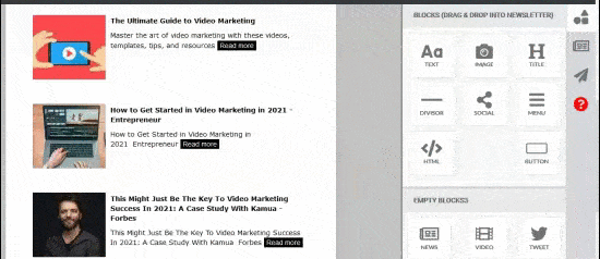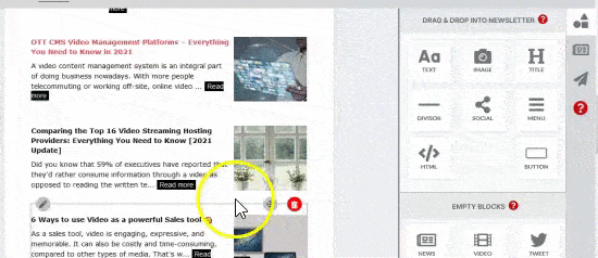 To add content, go to your content library and drag articles, images and gifs into your newsletter. Then, edit and change it from within the newsletter.